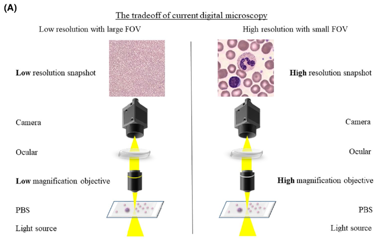 Further advancements in digital morphology have introduced full-field technology, which can scan the entire blood smear at 100x resolution. This approach provides a dynamic and comprehensive view of the sample, akin to viewing it through a microscope but with the added benefits of digital technology. Full-Field morphology (FFM) imaging, relates to the ability to achieve ‘big data’ high-resolution images within minutes. The underlying computational photography-based imaging breaks the traditional trade-off between resolution and field of view (FOV) area.